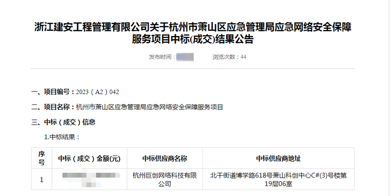 我司中标杭州市(shì)蕭山(shān)區(qū)<Ω↑應急管理(lǐ)局應急網絡安全保障服務項目。