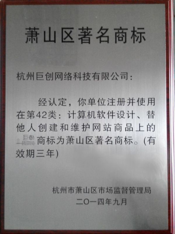 祝賀巨創商标被評為(wèi)蕭山(shān)區(qū)著名商标